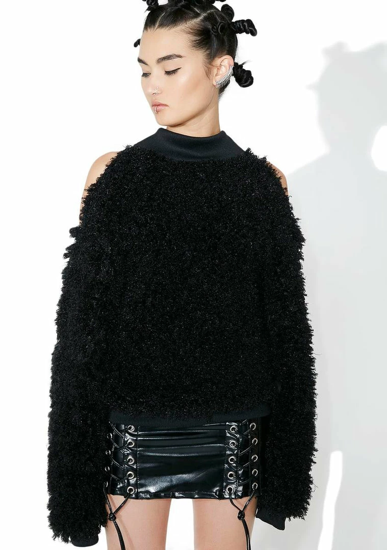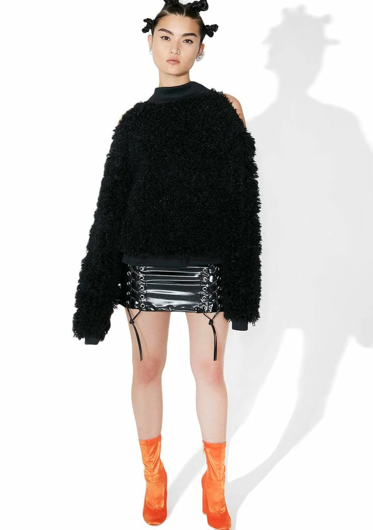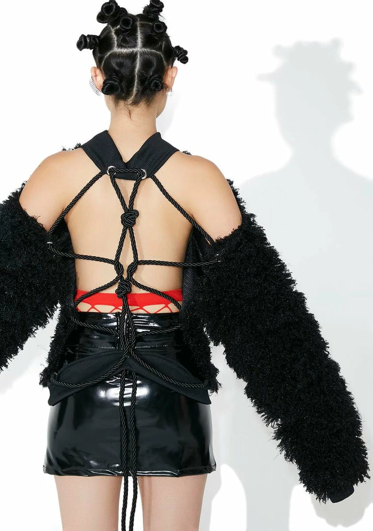 cuz the tightening of the ropes starts to feel like pure ecstasy to ya~ Bind Γ’ΒΒem to ya for life in this ultra luxxxe sweater, featurinΓ’ΒΒ a plush black fluffy knit construction, slightly slouched fit, thick ribbed trim, and an incredible open panel with thick black cord strung through grommets in traditional shibari knots. Wear this badd BB both ways depending on yr plans for the evening…
