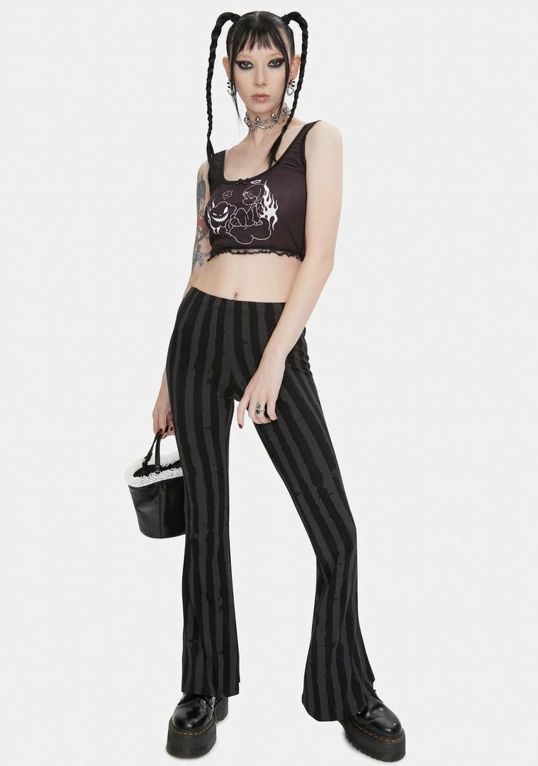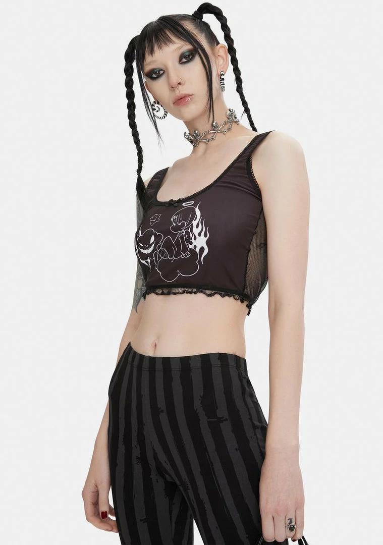 cuz youΓ’ΒΒre causing hell in heaven, babe. This crop tank has a mesh back, ruffle trim on the hem, a square neckline with a bow detail, and graphics on the front.