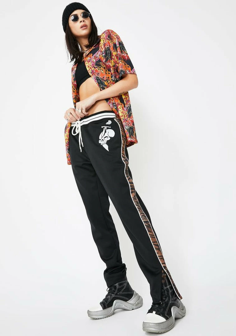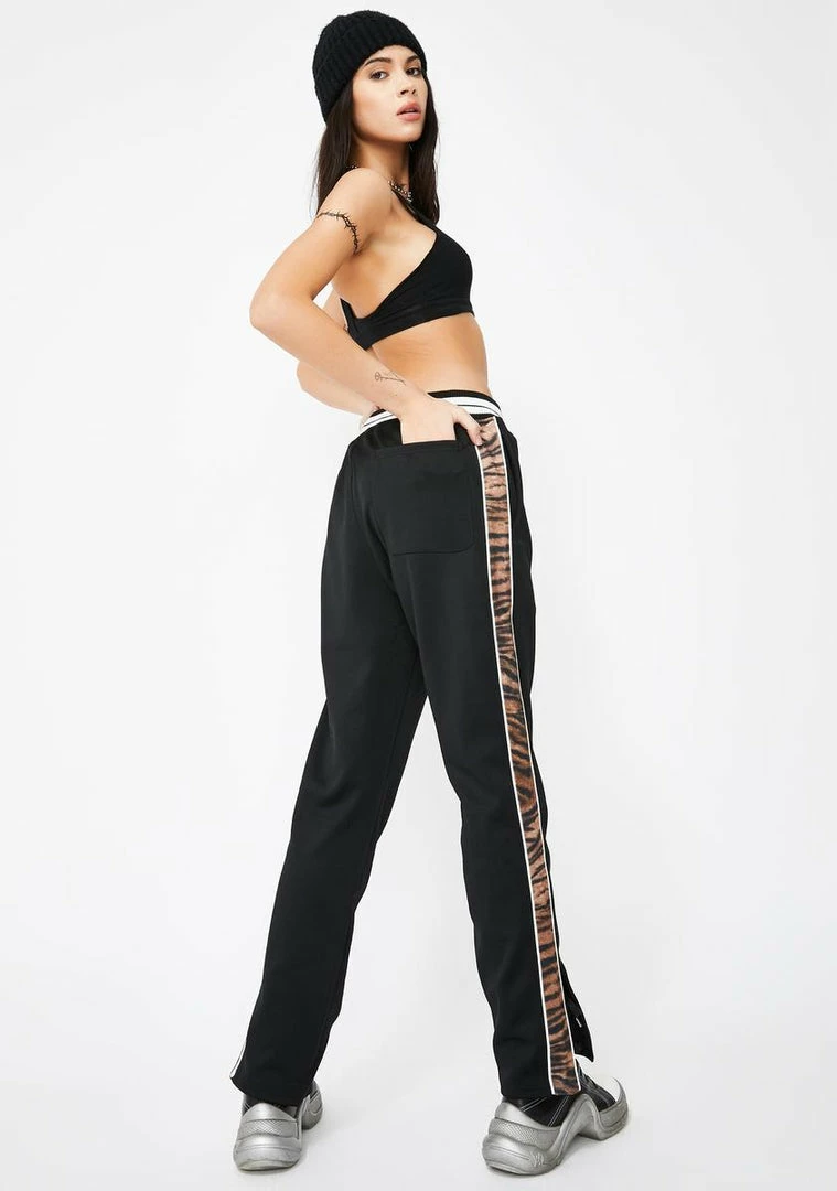 cuz youΓ’ΒΒre a wild one. Look dope AF in these luxe track pants that have a drawstring waistband, front NΓ’ΒΒ back pockets, contrast tiger prints on the sides, zippered ankle cuffs, and a tattoo logo graphic on the leg.