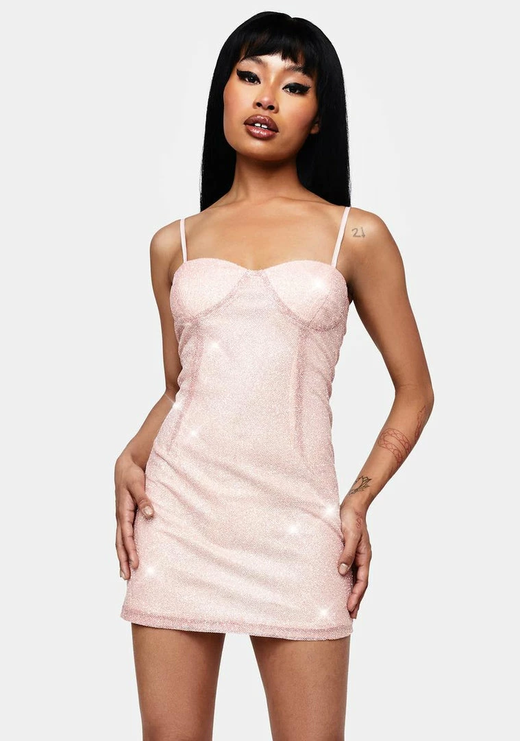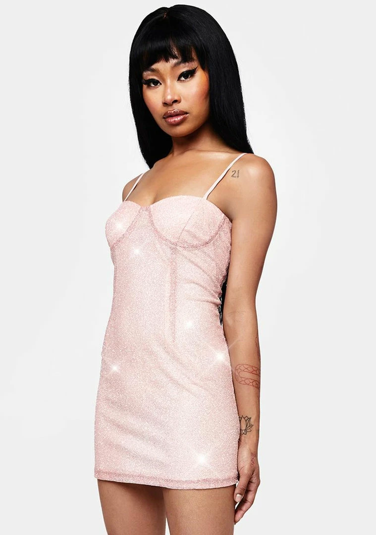 because you’re my forever fantasy. Feel yourself in this bodycon mini dress with a structured bust, glitter encrusted construction, cami straps, and a zipper closure in back.