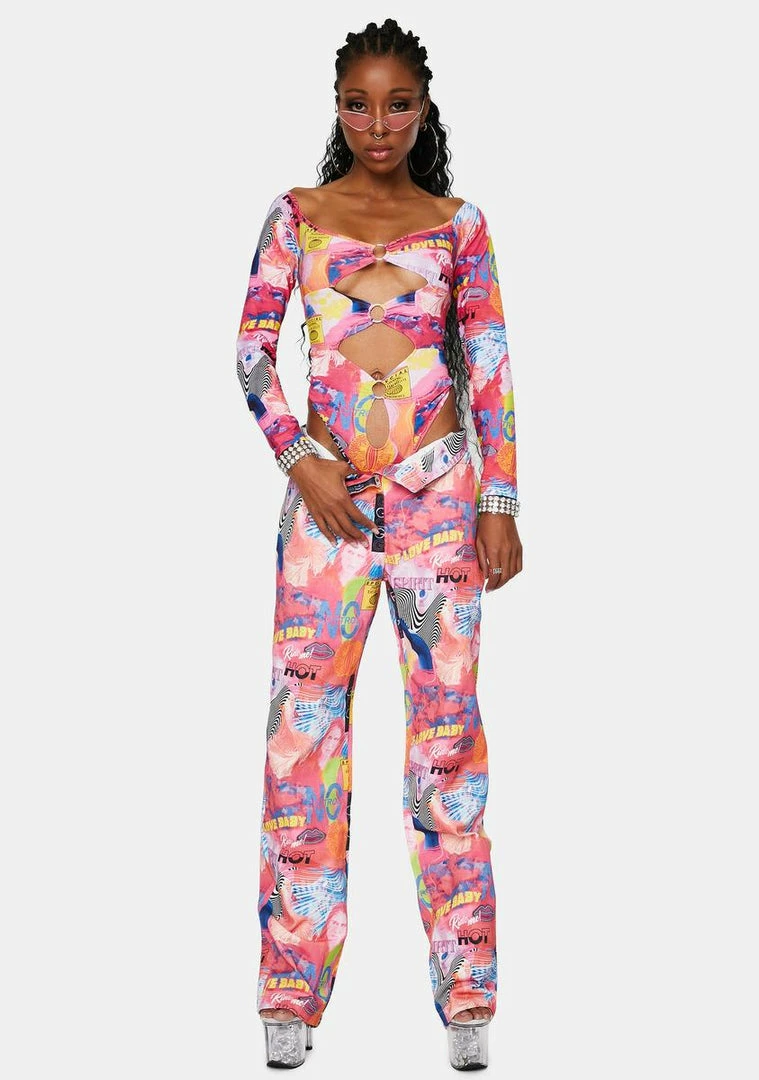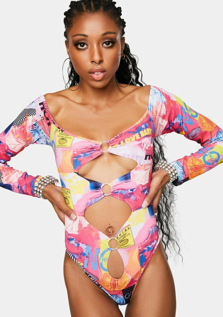 cuz itΓ’ΒΒs all about self love, babe! This long sleeve cut-out bodysuit has a scoop neckline, triple O-ring hardware on the front, a thong back, and a psychedelic print all over.