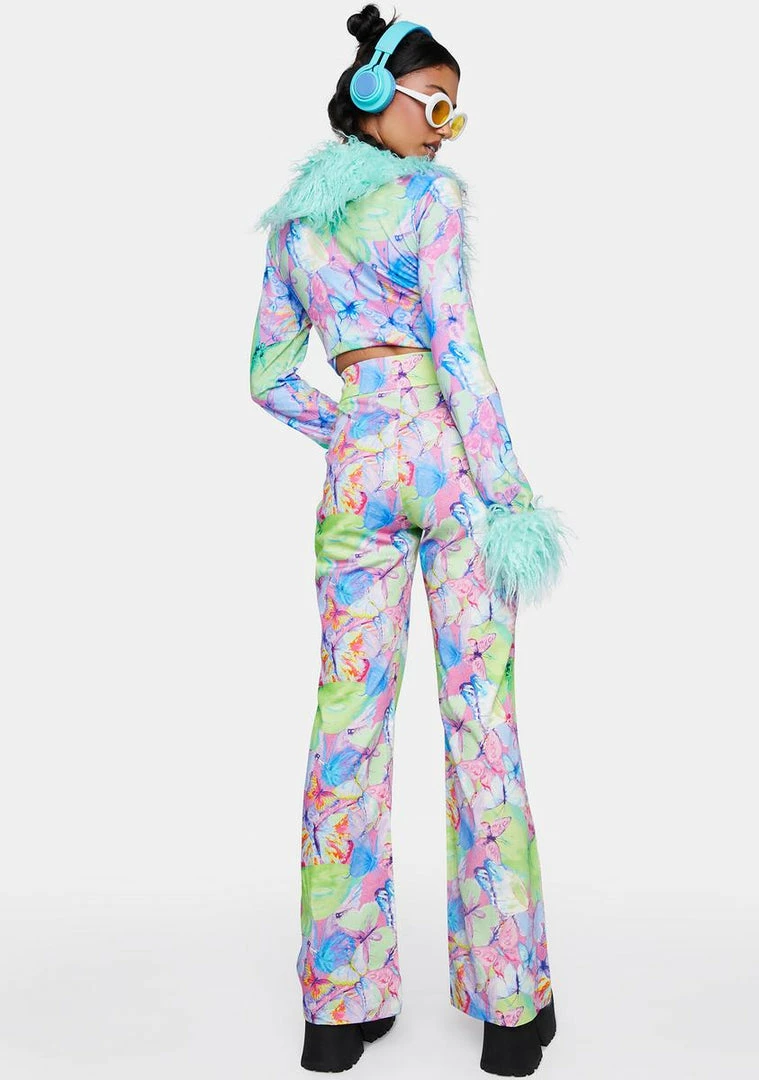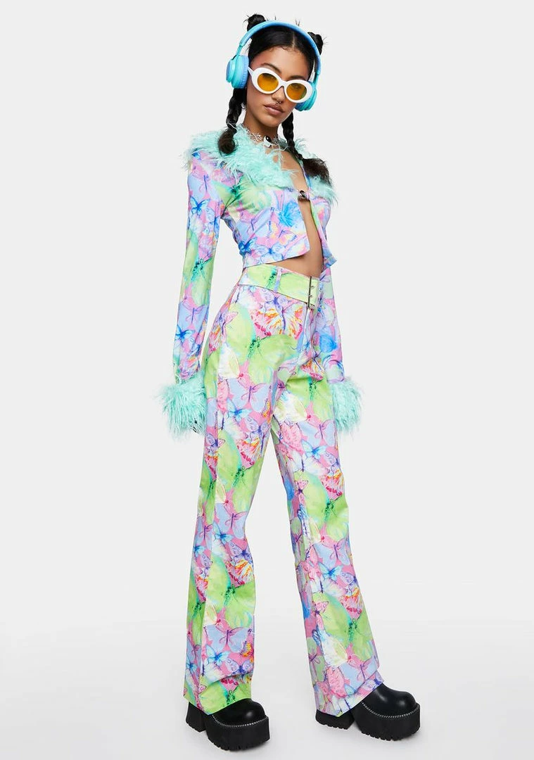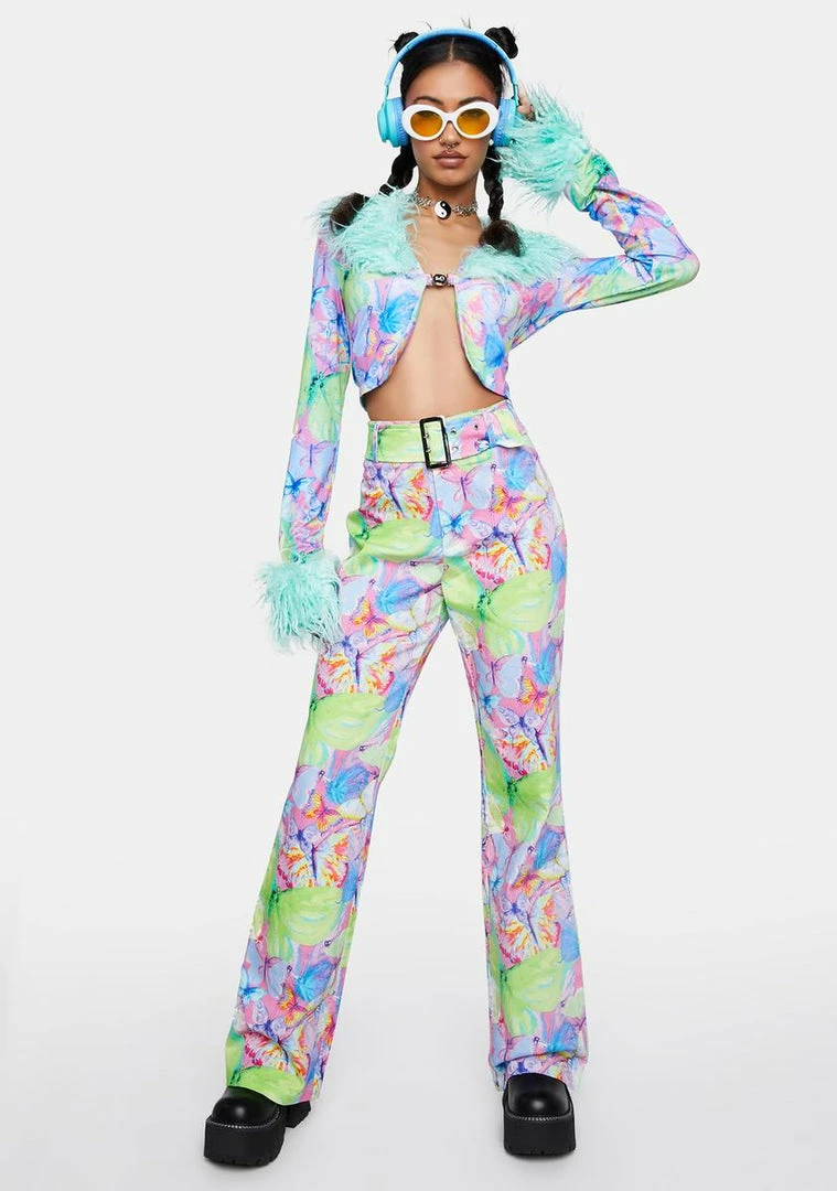 cuz it’s time for a change. These high-waisted pants have an electrifying butterfly print all over, a matching fabric belt, a zip fly, and bootcut legs.