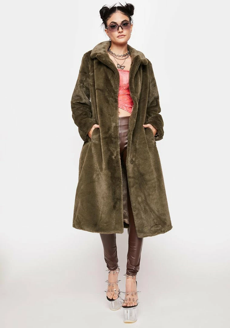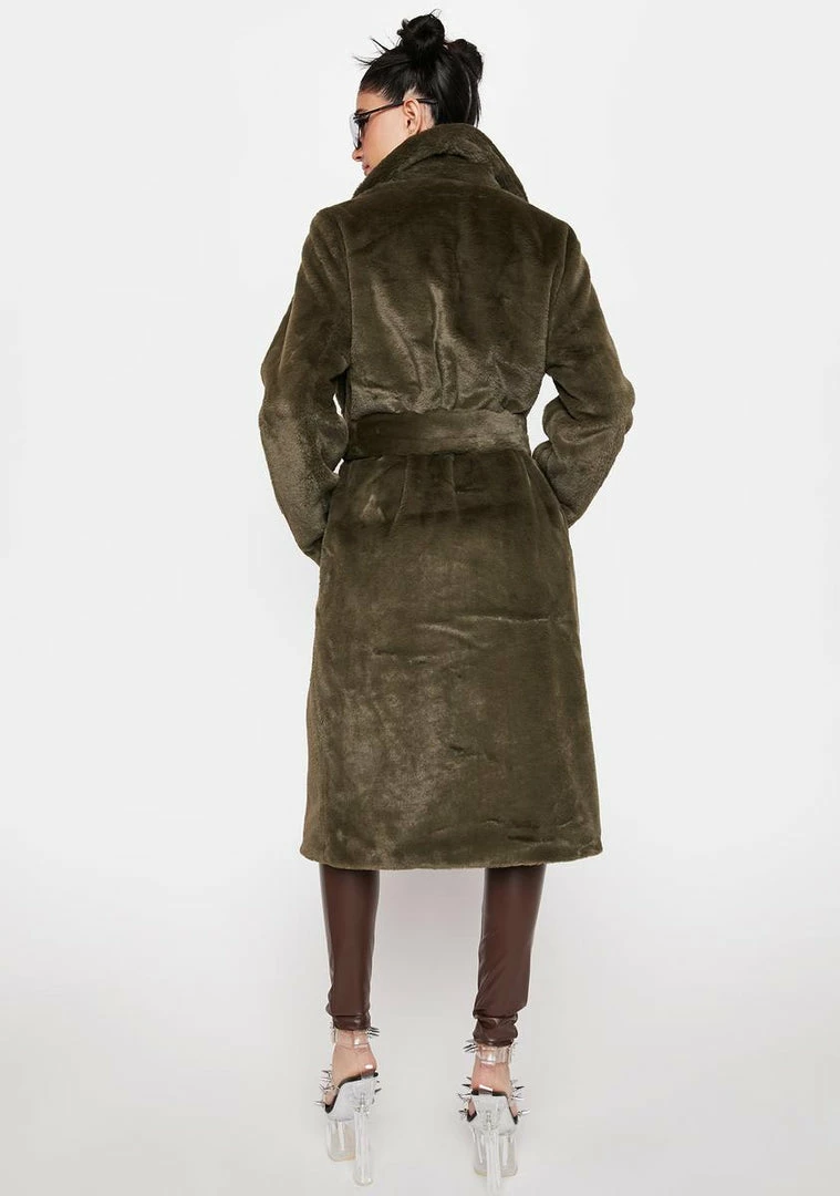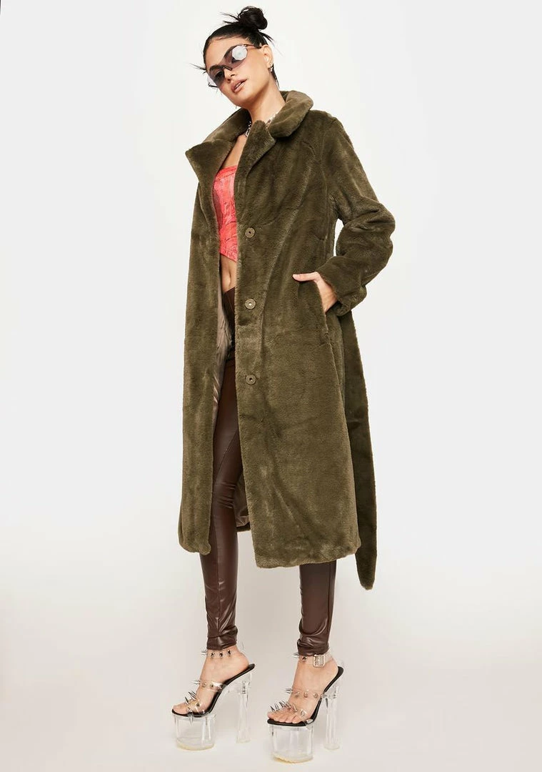 cuz you’re staying cozy. This long length coat has a super soft faux fur construction, snap button closures on the front, pockets on the sides, and a removable sash tie belt.