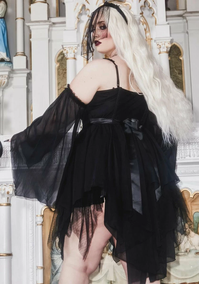 cuz you’re eternally entwined with the moonlight. This mini dress has a layered chiffon and netting construction with a handkerchief hem, lace applique trim, padded cups with underwire support, corset boning in the bodice, adjustable shoulder straps, a side zip closure, detachable bell sleeves, and comes with a veiled headband.